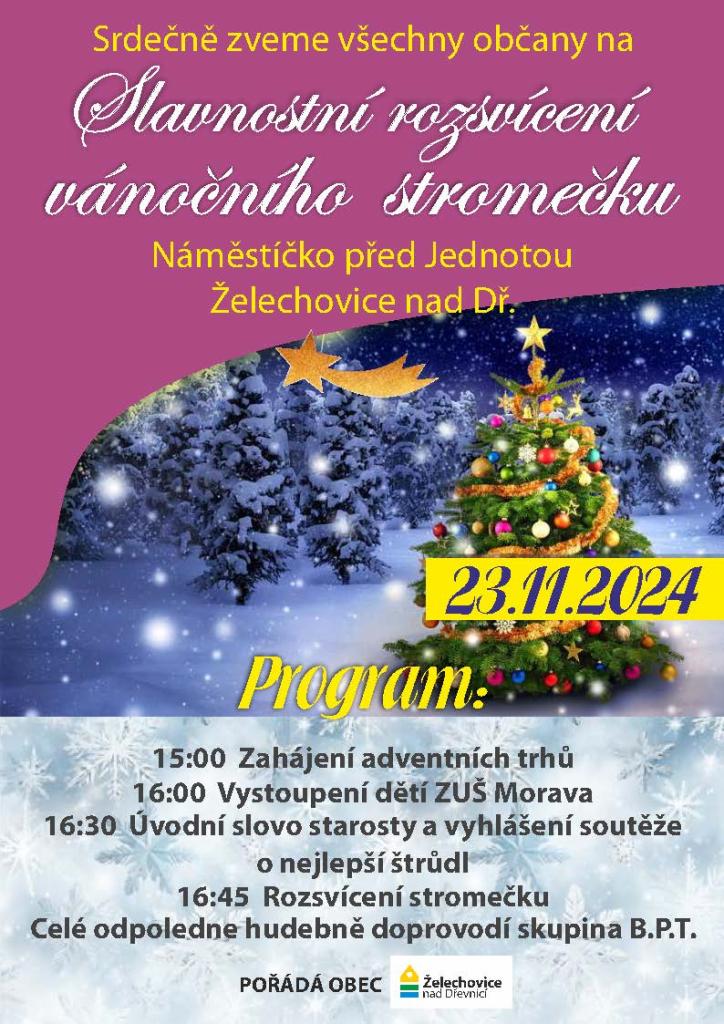 Zveme všechny občany na slavnostní rozsvícení vánočního stromu, které se letos opět uskuteční v prostorách před obchodem Jednota v Želechovicích nad Dřevnicí v sobotu 23. listopadu 2024 od 15:00 hodin.