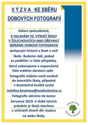 Vážení spoluobčané, K OSLAVÁM 70. VÝROČÍ ŠKOLY V ŽELECHOVICÍCH NAD DŘEVNICÍ SBÍRÁME DOBOVÉ FOTOGRAFIE zachycující historii a život v naší škole. Budeme rádi, pokud se podělíte i o Vaše příspěvky, které oskenujeme a neporušené Vám vrátíme obratem zpět. Fotografie můžete nosit osobně do kanceláře školy, případně v dostatečné kvalitě zaslat emailem na martina.kovarova@zszelechovice.cz. Fotografie sbíráme do konce července. V době letních prázdnin je škola otevřena v určených dnech dle rozpisu na webu školy.