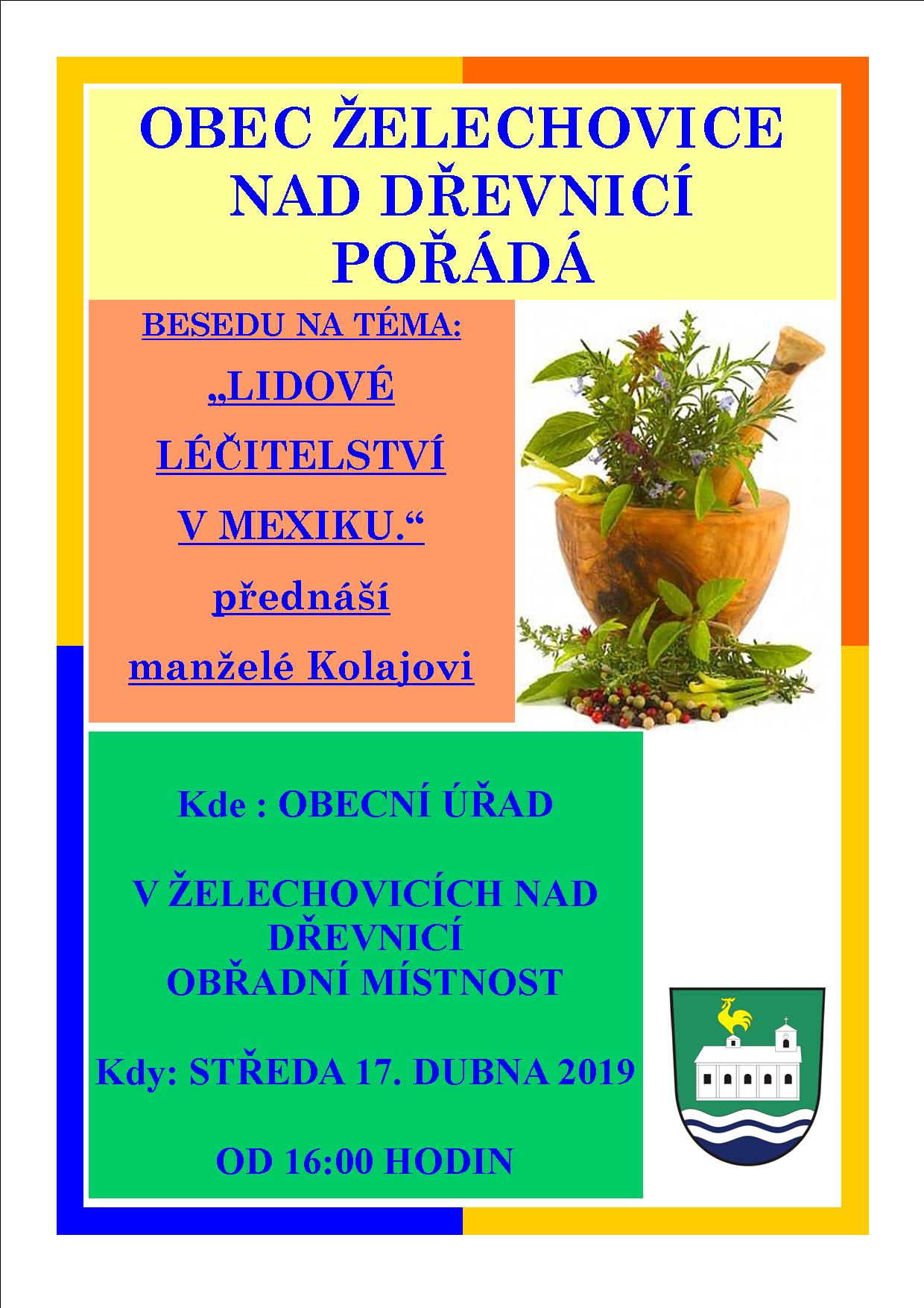 Ve středu 17. dubna 2019 od 16:00 hodin v budově OÚ v obřadní místnosti se bude konat beseda na téma "Lidové léčitelství v MEXIKU", přednášet budou manželé Kolajovi.