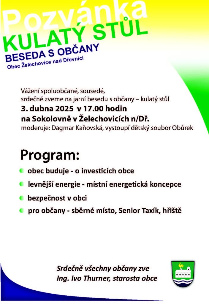 Zveme občany do místní Sokolovny ve čtvrtek 3. dubna 2025 na „Besedu s občany u kulatého stolu“. Začátek je v 17:00 hodin. Občerstvení je zajištěno.