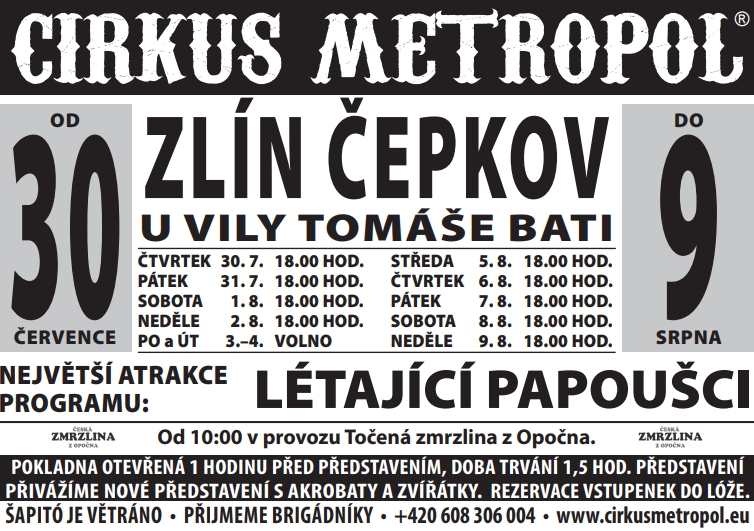 V týdnu od čtvrtka 30. července 2020 do neděle 9. srpna 2020, bude cirkus Metropol hostovat ve Zlíně.