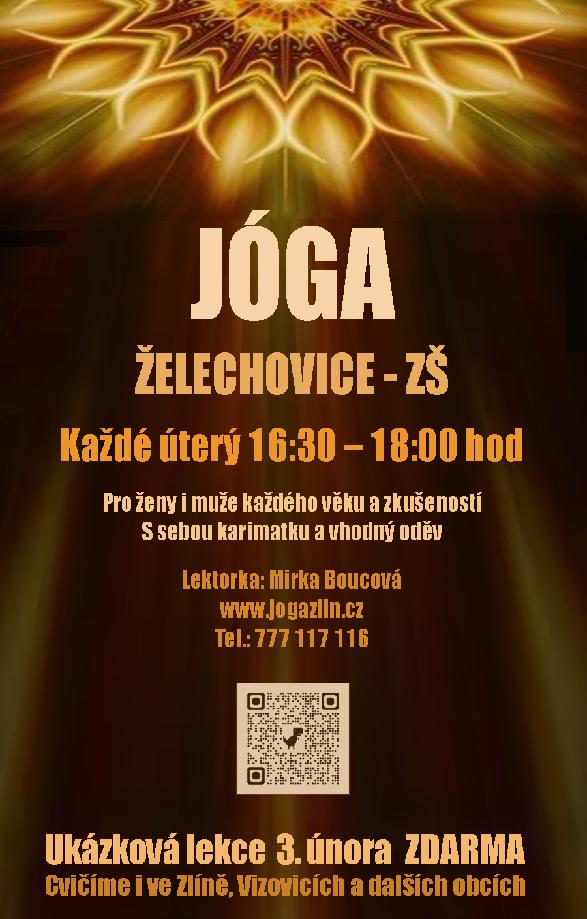 v měsíci únoru začíná u nás v Želechovicích na základní škole nový kurz jógy pro dospělé. Srdečně zveme na bezplatnou zkušební lekci, která se uskuteční v úterý 3.2.2026 od 16:30 hodin. Více informací naleznete na www.jogazlin.cz. Cvičit se dále bude každé úterý ve stejný čas.