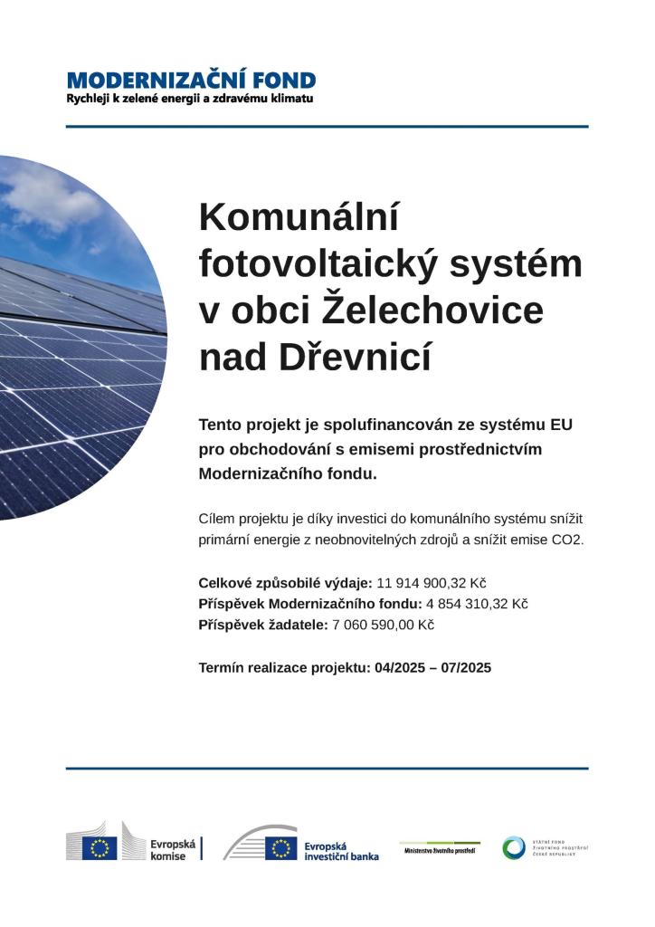 Cílem projektu bylo vybudování komunálního fotovoltaického systému na budově mateřské a základní školy v obci Želechovice nad Dřevnicí. Touto investicí došlo ke snížení emisí skleníkových plynů, modernizaci energetických systémů a zvýšení podílu obnovitelných zdrojů energie na konečné spotřebě elektrické energie.