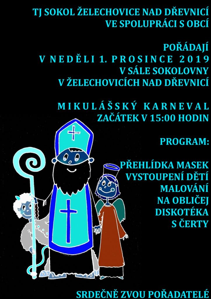 V neděli 1. prosince 2019 od 15:00 hodin se bude na Sokolovně v Želechovicích nad Dřevnicí konat MIKULÁŠSKÝ KARNEVAL.
