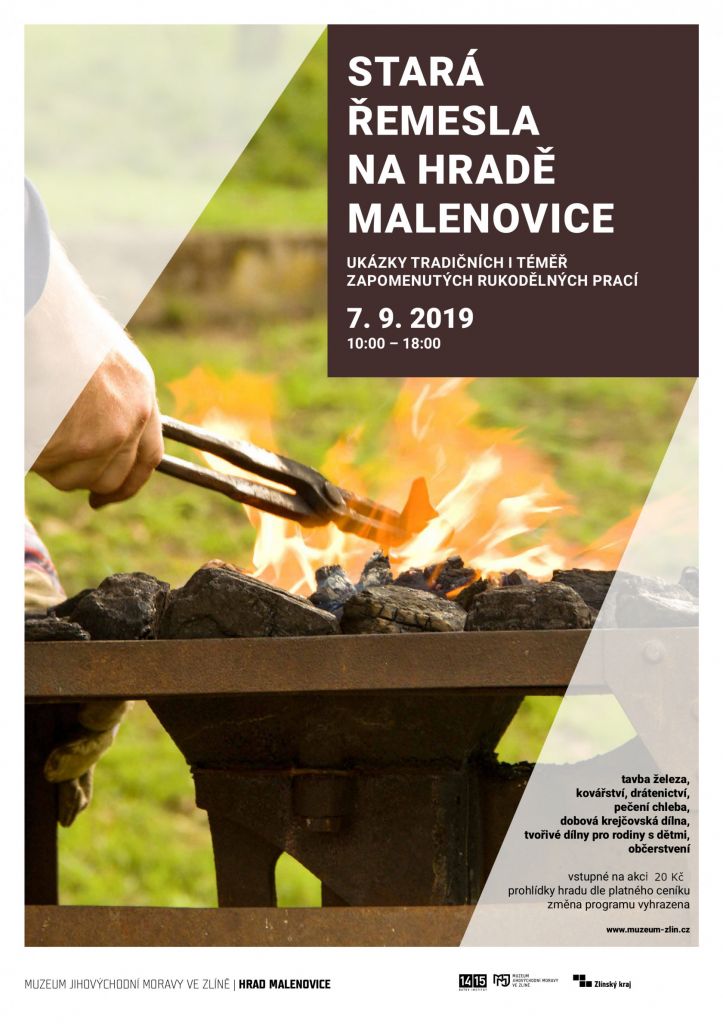 V sobotu 7. září 2019 na akci STARÁ ŘEMESLA NA HRADĚ MALENOVICE. Od 10 do 18 hodin tady na Vás v předhradí budou čekat ukázky starých rukodělných technik - od pečení chleba v chlebové peci či zdobení perníčků přes tavbu železa v replice pece z 11. století, zpracování železa kovářem či dráteníkem, ukázky textilních technik nebo komentované prohlídky expozice Dřevo proutí sláma a odborný výklad k ukázkám sbírkových archeologických předmětů.