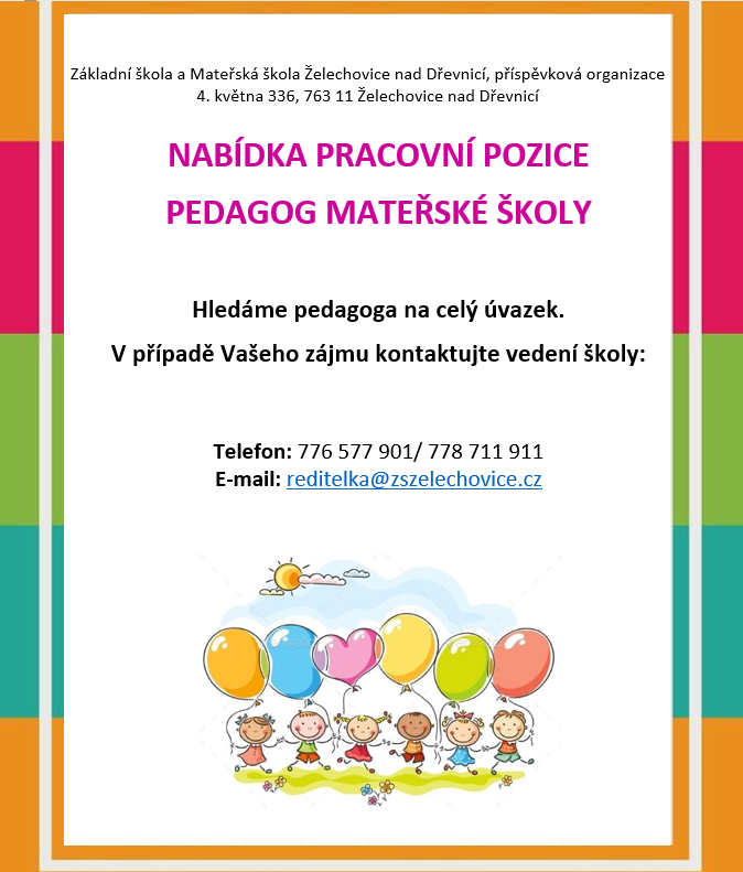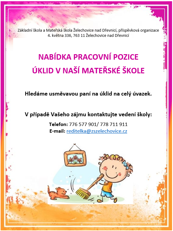 MŠ v Želechovicích nad Dřevnicí hledá paní na úklid a pedagoga na celý úvazek.
