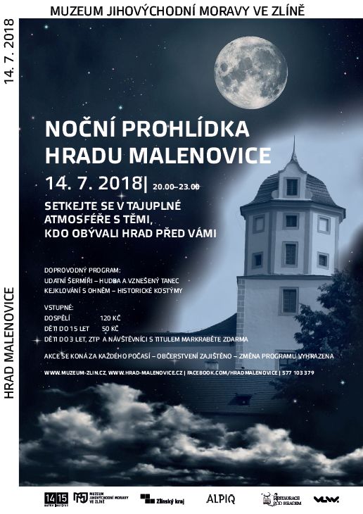 Noční prohlídky hradu Malenovice se uskuteční v sobotu 14. července od 20.00 do 23.00. Kromě možnosti projít si hrad bez průvodce od sklepa až do věže ve zvláštní atmosféře večera a noci budou na návštěvníky uvnitř čekat někteří z původních majitelů hradu. Také bude příležitost sledovat zuřivé šermířské souboje nebo ladné tance elegantních dam, které občas vystřídají kejklíři s ohněm. Akce se koná za každého počasí. Pokud ji nestihnete, budete mít ještě jednu příležitost, a to 18. srpna 2018.