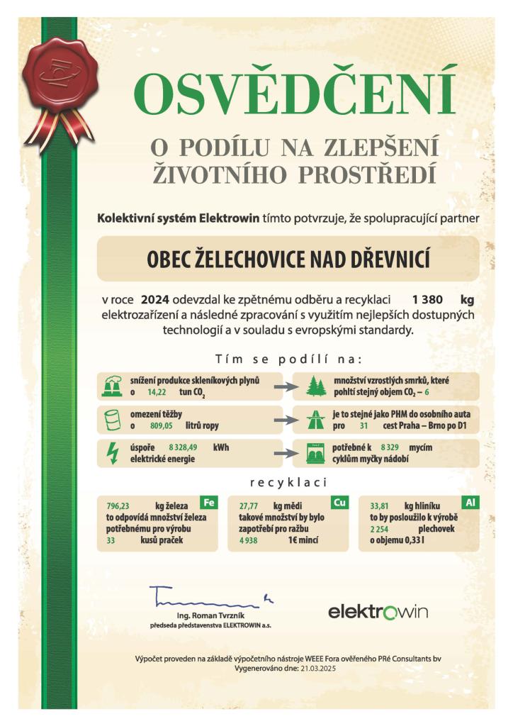Osvědčení o podílu na zlepšení životního prostředí pro naši obec.