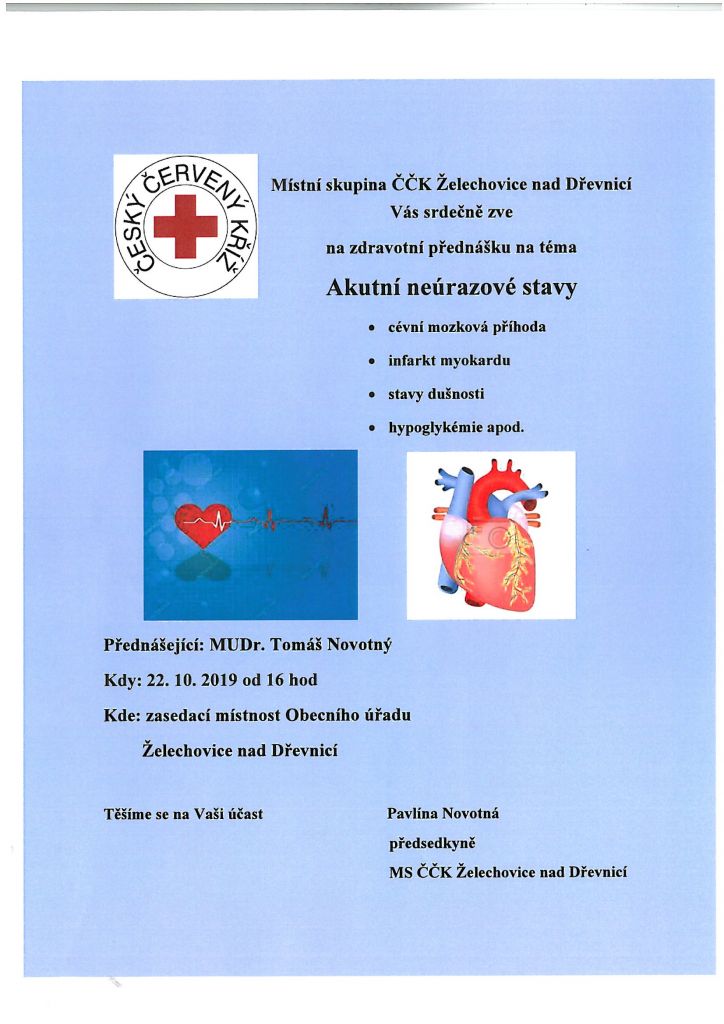 Místní skupina ČČK Želechovice nad Dřevnicí pořádá v úterý 22. října 2019 v zasedací místnosti obecního úřadu v Želechovicích nad Dřevnicí zdravotní přednášku na téma AKUTNÍ NEÚRAZOVÉ STAVY, přednáší MUDr. Tomáš Novotný.