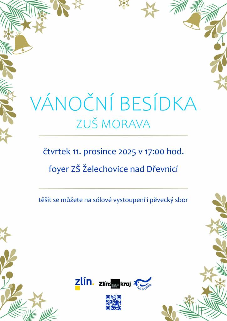 ZUŠ MORAVA zve na vánoční besídku, která se bude konat ve čtvrtek 11. prosince 2025 v 17:00 v ZŠ Želechovice nad Dřevnicí.
