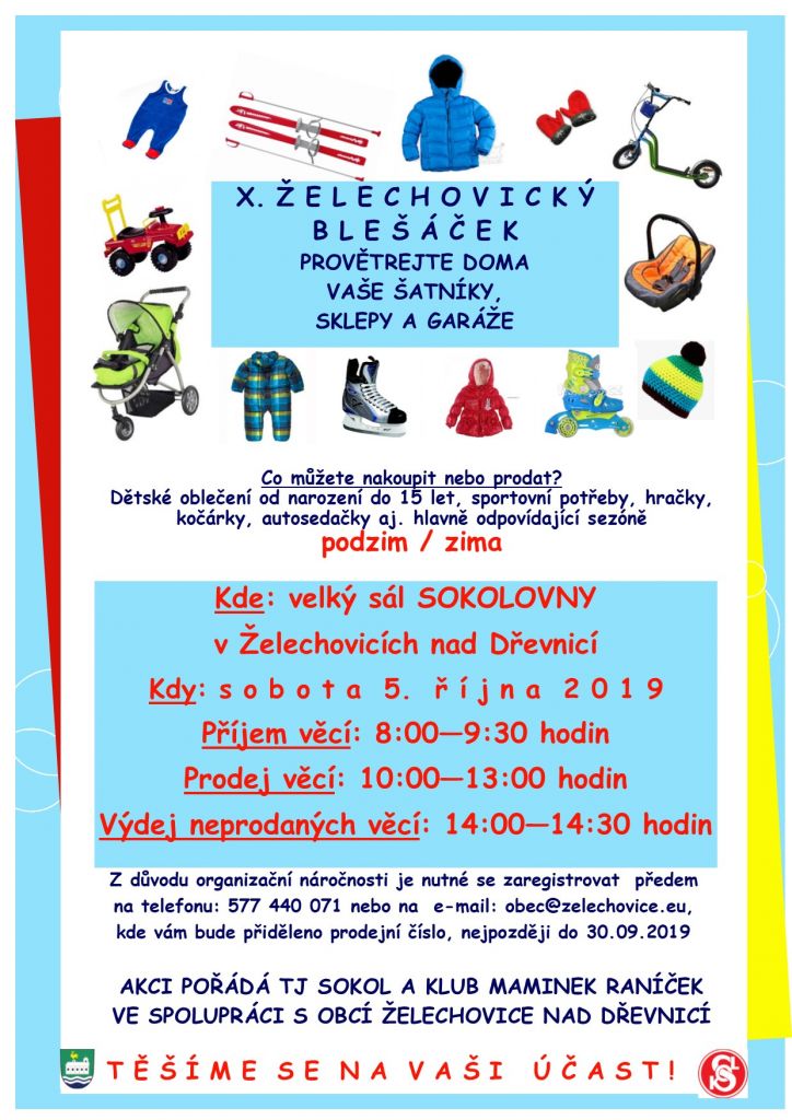 V sobotu dne 5. října 2019 se v sále místní Sokolovny konal již „X. ŽELECHOVICKÝ BLEŠÁČEK“. Obec ve spolupráci s místním klubem maminek RANÍČEK nabídla příležitost občanům přinést do Sokolovny dětské oblečení nebo sportovní potřeby, hračky, kočárky, kola, brusle, autosedačky aj., ale hlavně věci, které odpovídaly sezóně podzim/zima. K prodeji se zaregistrovalo 36 prodejců ze Želechovic nad Dřevnicí, ale i okolí.